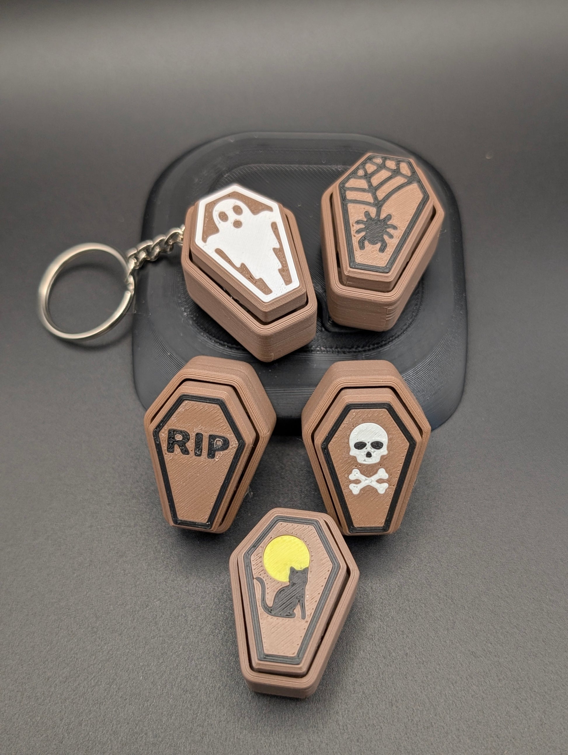 Add a spooky twist to your fidgeting with the Coffin and Tombstone Clickers! These playful fidget toys come in a coffin shape with various eerie designs to match your Halloween vibe and also a tombstone and soil design with different images on the tombstone. Choose your favorite image and easily transform it into a keychain in desired, so you can carry the fun and a touch of spooky wherever you go. Perfect for chilling out with a creepy-cool flair!